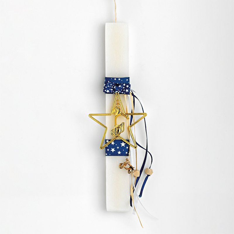 Αυτή η πασχαλινή λαμπάδα με θέμα αστέρι είναι χειροποίητη και αρωματική, κατασκευασμένη για να εντυπωσιάσει με την εξαιρετική ποιότητα της και τα ζωηρά χρώματα της. Πολύχρωμες κορδέλες και στοιχεία που απεικονίζουν το αστεράκι την στολίζουν. Το κερί είναι ιδανικά διακοσμημένο για να χρησιμοποιηθεί ως διακοσμητικό στο παιδικό δωμάτιο μετά την Ανάσταση. Κάντε δώρο στα αγαπημένα σας πρόσωπα μία πασχαλινή λαμπάδα η οποία ξεχωρίζει και θα μείνει στο βάθος του χρόνου.