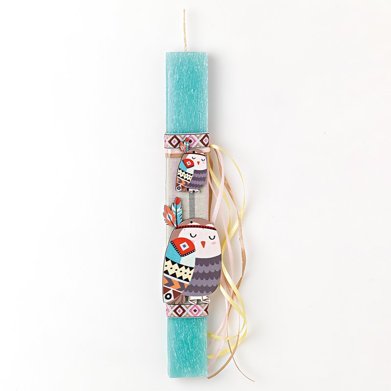 Αυτή η πασχαλινή λαμπάδα με θέμα ινδιανάκι κουκουβάγια είναι χειροποίητη και αρωματική, κατασκευασμένη για να εντυπωσιάσει με την εξαιρετική ποιότητα της και τα ζωηρά χρώματα της. Πολύχρωμες κορδέλες και στοιχεία που απεικονίζουν το ινδιανάκι κουκουβάγια την στολίζουν. Το κερί είναι ιδανικά διακοσμημένο για να χρησιμοποιηθεί ως διακοσμητικό στο παιδικό δωμάτιο μετά την Ανάσταση. Κάντε δώρο στα αγαπημένα σας πρόσωπα μία πασχαλινή λαμπάδα η οποία ξεχωρίζει και θα μείνει στο βάθος του χρόνου.