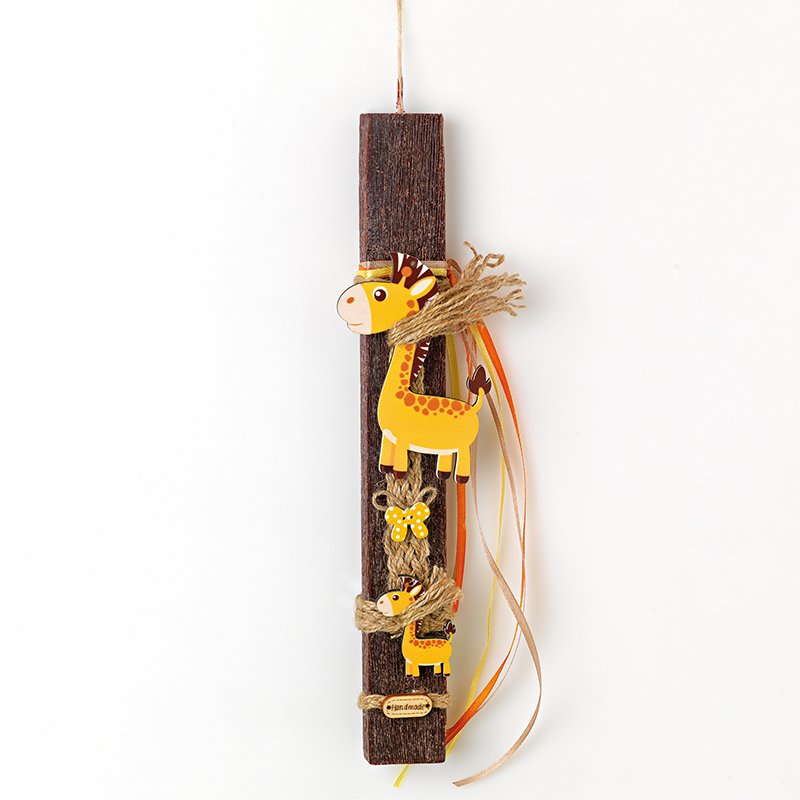 Αυτή η πασχαλινή λαμπάδα με θέμα καμηλοπάρδαλη είναι χειροποίητη και αρωματική, κατασκευασμένη για να εντυπωσιάσει με την εξαιρετική ποιότητα της και τα ζωηρά χρώματα της. Πολύχρωμες κορδέλες και στοιχεία που απεικονίζουν τη καμηλοπάρδαλη την στολίζουν. Το κερί είναι ιδανικά διακοσμημένο για να χρησιμοποιηθεί ως διακοσμητικό στο παιδικό δωμάτιο μετά την Ανάσταση. Κάντε δώρο στα αγαπημένα σας πρόσωπα μία πασχαλινή λαμπάδα η οποία ξεχωρίζει και θα μείνει στο βάθος του χρόνου.