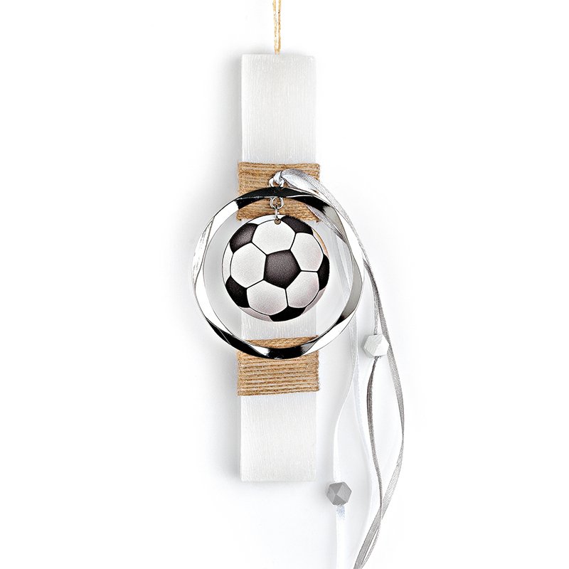 Αυτή η πασχαλινή λαμπάδα με θέμα ποδοσφαιρική ομάδα είναι χειροποίητη και αρωματική, κατασκευασμένη για να εντυπωσιάσει με την εξαιρετική ποιότητα της και τα ζωηρά χρώματα της. Πολύχρωμες κορδέλες και στοιχεία που απεικονίζουν την ποδοσφαιρική μπάλα της ομάδας την στολίζουν. Το κερί είναι ιδανικό για να χρησιμοποιηθεί ως διακοσμητικό στο παιδικό δωμάτιο μετά την Ανάσταση. Κάντε δώρο στα αγαπημένα σας πρόσωπα μία πασχαλινή λαμπάδα η οποία ξεχωρίζει και θα μείνει στο βάθος του χρόνου.