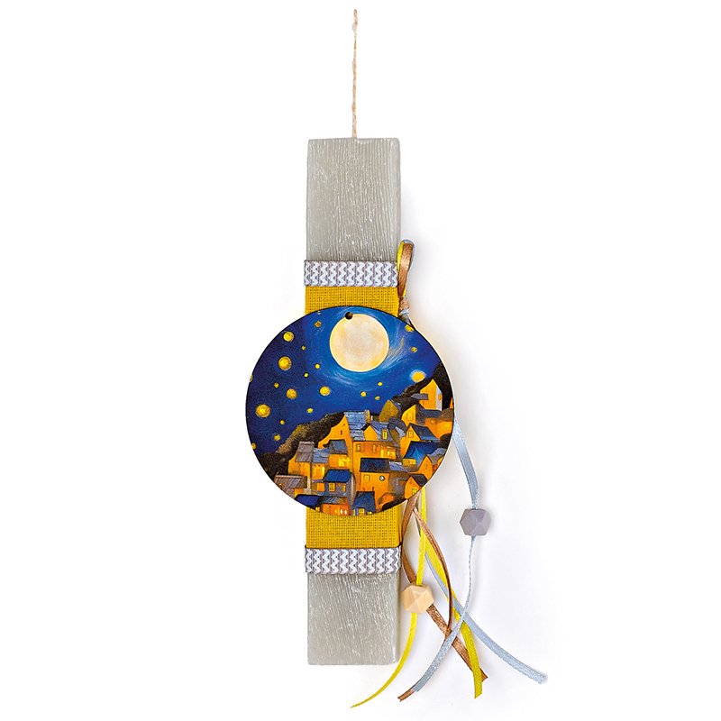 Αυτή η πασχαλινή λαμπάδα με θέμα πόλη στο φεγγαρόφωτος είναι χειροποίητη και κατασκευασμένη για να εντυπωσιάσει με την εξαιρετική ποιότητα της και τα ζωηρά χρώματα της. Κάντε δώρο στα αγαπημένα σας πρόσωπα μία πασχαλινή λαμπάδα η οποία ξεχωρίζει και θα μείνει στο βάθος του χρόνου.