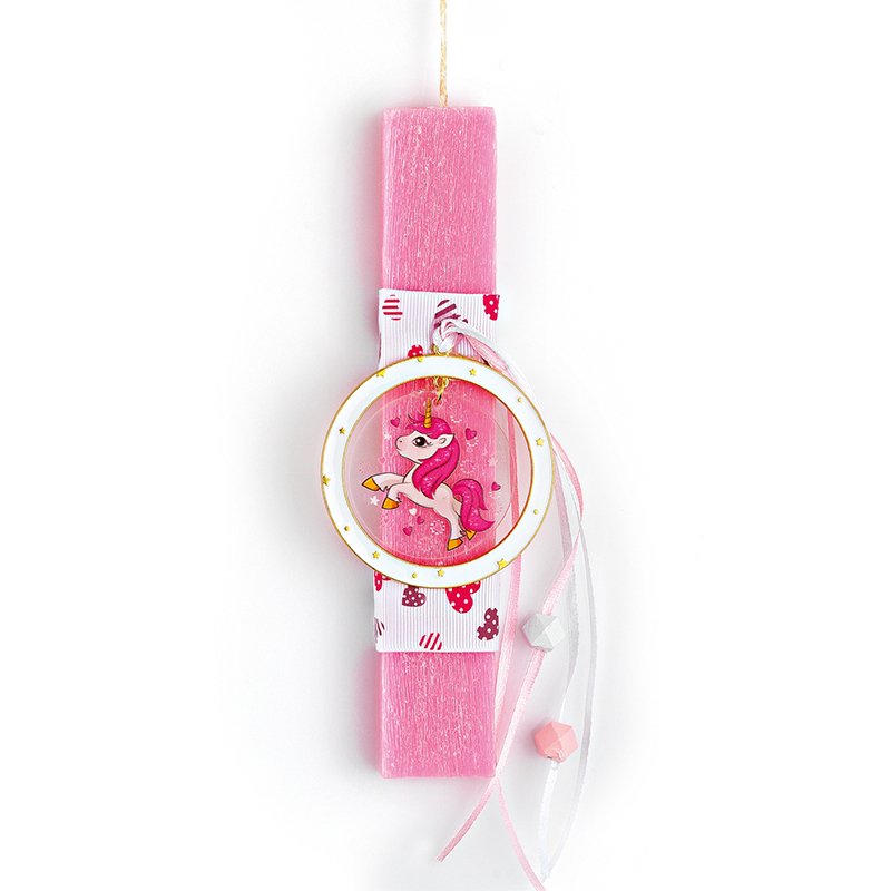 Αυτή η πασχαλινή λαμπάδα με θέμα πόνι είναι χειροποίητη και αρωματική, κατασκευασμένη για να εντυπωσιάσει με την εξαιρετική ποιότητα της και τα ζωηρά χρώματα της. Πολύχρωμες κορδέλες και στοιχεία που απεικονίζουν το πόνι την στολίζουν. Το κερί είναι ιδανικά διακοσμημένο για να χρησιμοποιηθεί ως διακοσμητικό στο παιδικό δωμάτιο μετά την Ανάσταση. Κάντε δώρο στα αγαπημένα σας πρόσωπα μία πασχαλινή λαμπάδα η οποία ξεχωρίζει και θα μείνει στο βάθος του χρόνου.