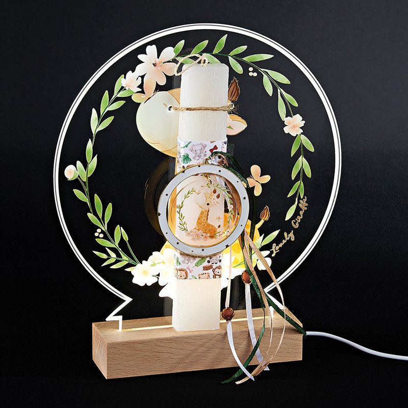 Αυτή η πασχαλινή λαμπάδα με θέμα καμηλοπάρδαλη είναι χειροποίητη και αρωματική, κατασκευασμένη για να εντυπωσιάσει με την εξαιρετική ποιότητα της και τα ζωηρά χρώματα της. Πολύχρωμες κορδέλες και στοιχεία την στολίζουν. Το κερί βρίσκεται τοποθετημένο πάνω σε θεματική πλάτη από plexiglass πάνω σε ξύλινη LED βάση ιδανική για να χρησιμοποιηθεί ως διακοσμητικό στο παιδικό δωμάτιο μετά την Ανάσταση. Κάντε δώρο στα αγαπημένα σας πρόσωπα μία πασχαλινή λαμπάδα η οποία ξεχωρίζει και θα μείνει στο βάθος του χρόνου.