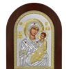 Ασημένια εικόνα η Παναγία η Γιάτρισσα με επίχρυσες λεπτομέρειες και σμάλτο σε καφέ ξύλο.