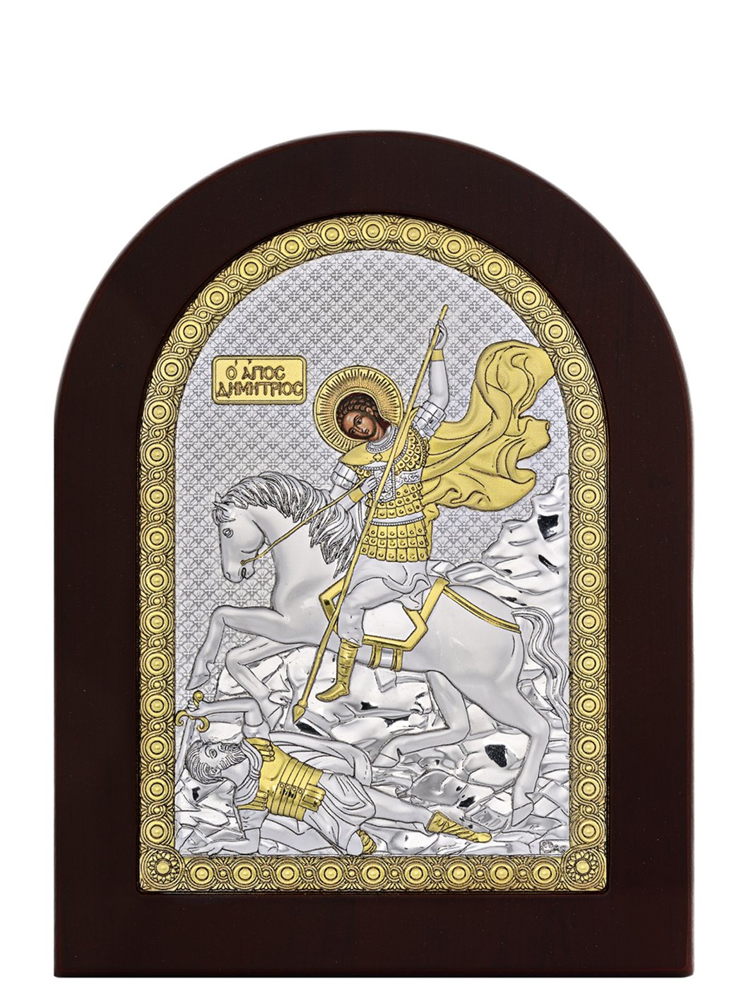 Αποκτήστε ένα σύμβολο πίστης, δύναμης και προστασίας με την Ασημένια Εικόνα του Αγίου Δημητρίου. Ο Άγιος Δημήτριος, ο Μεγαλομάρτυρας και Μυροβλύτης της Θεσσαλονίκης, είναι ένας από τους πιο σεβαστούς Αγίους της Ορθοδοξίας. Ως στρατιώτης-Άγιος, συμβολίζει το θάρρος και την ακλόνητη πίστη, ενώ η ιδιότητά του ως Μυροβλύτης τον καθιστά σύμβολο της θείας χάρης και της επούλωσης.