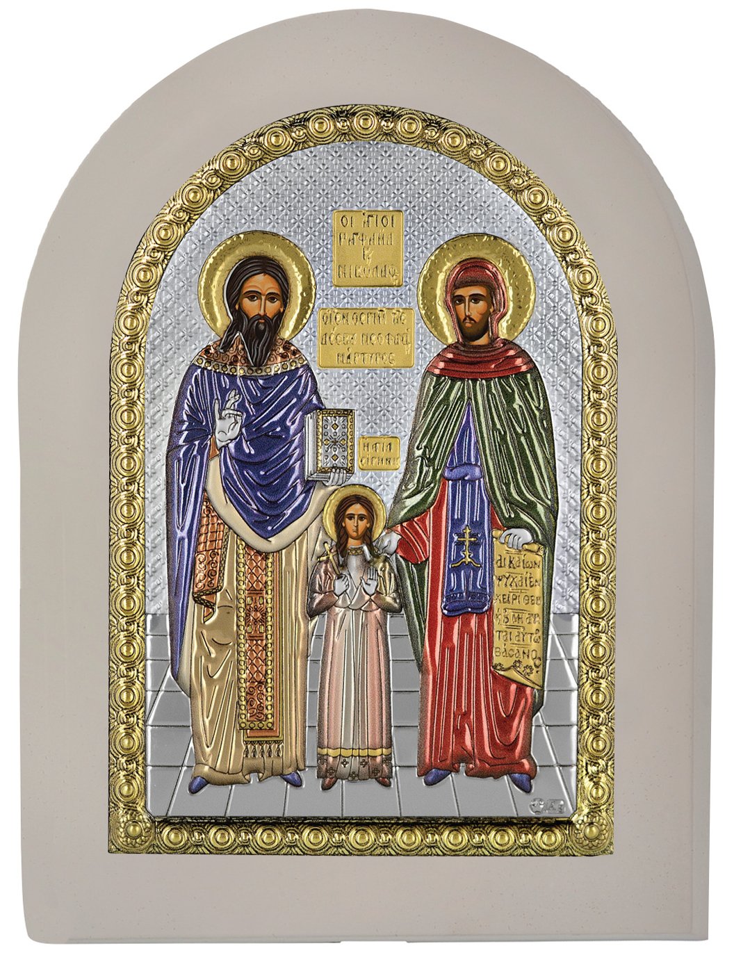 Ασημένια Εικόνα Άγιοι Ραφαήλ, Νικόλαος & Ειρήνη 20x26cm. Προστάτες & Ιαματικοί.