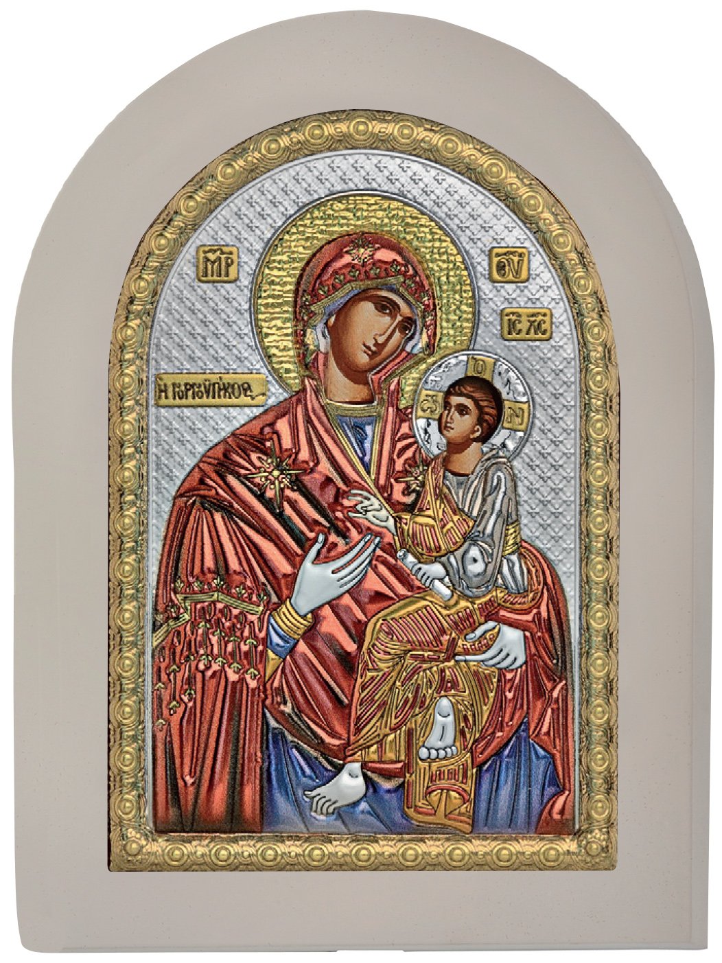 Ασημένια εικόνα Παναγία Γοργουπήκοος με επίχρυσες λεπτομέρειες και σμάλτο σε λευκό ξύλο.