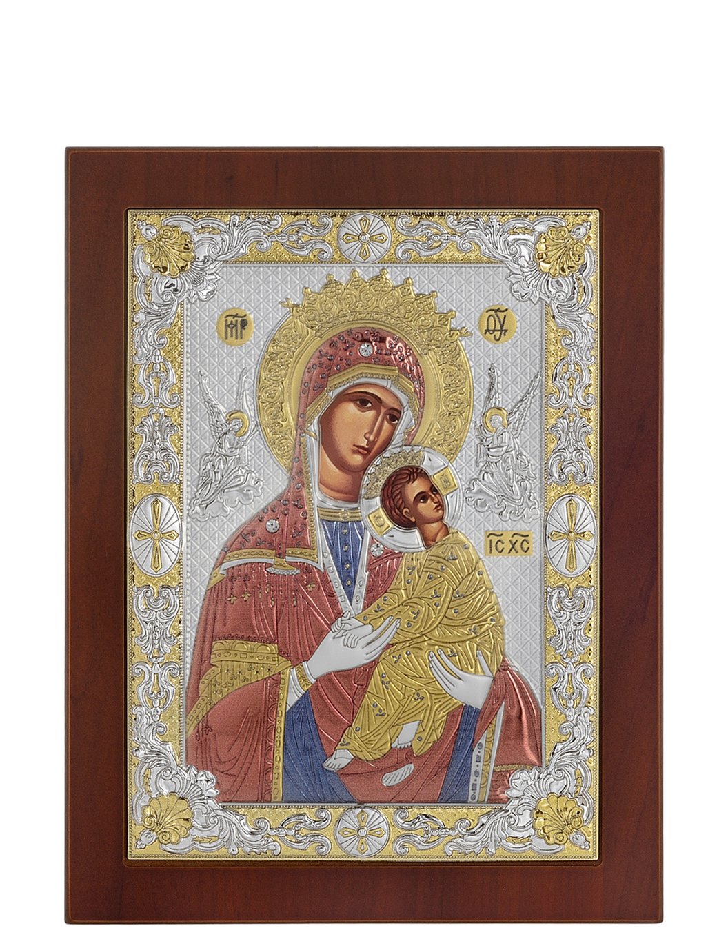 Ασημένια εικόνα Παναγία η Αμόλυντος με επίχρυσες λεπτομέρειες σε καφέ ξύλο.