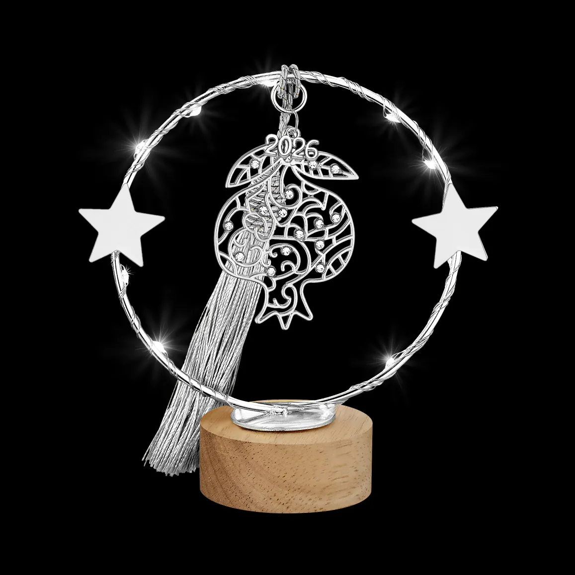 Φωτιζόμενο Γούρι 2026 Ασημί Ρόδι σε Ξύλινη Βάση