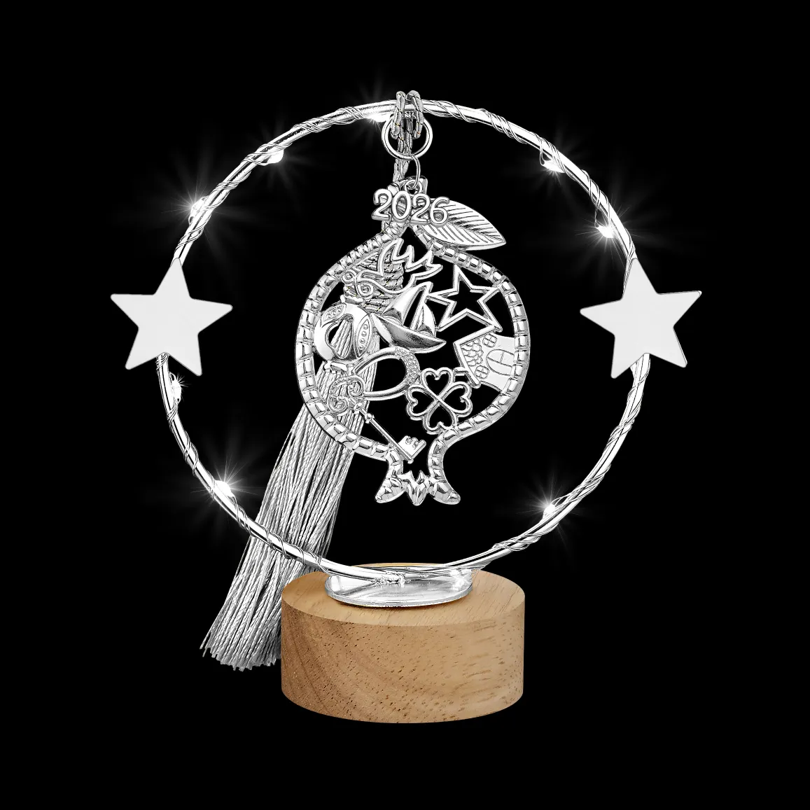 Φωτιζόμενο Γούρι 2026 Ασημί Ρόδι σε Ξύλινη Βάση