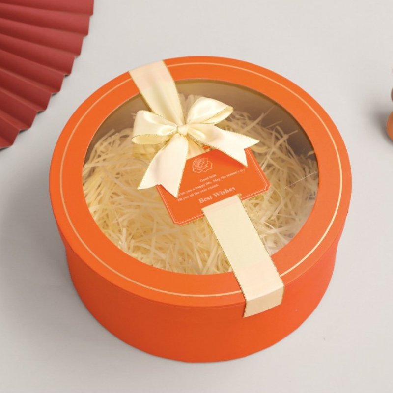 Κουτί δώρου πολυτελείας στρογγυλό σε πορτοκαλί χρώμα, κατασκευασμένο από εξαιρετικής ποιότητας χαρτόνι, με διάφανο καπάκι, έτοιμο φιόγκο από σατέν κορδέλα και κάρτα με ευχές.