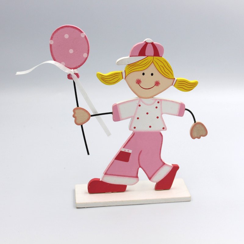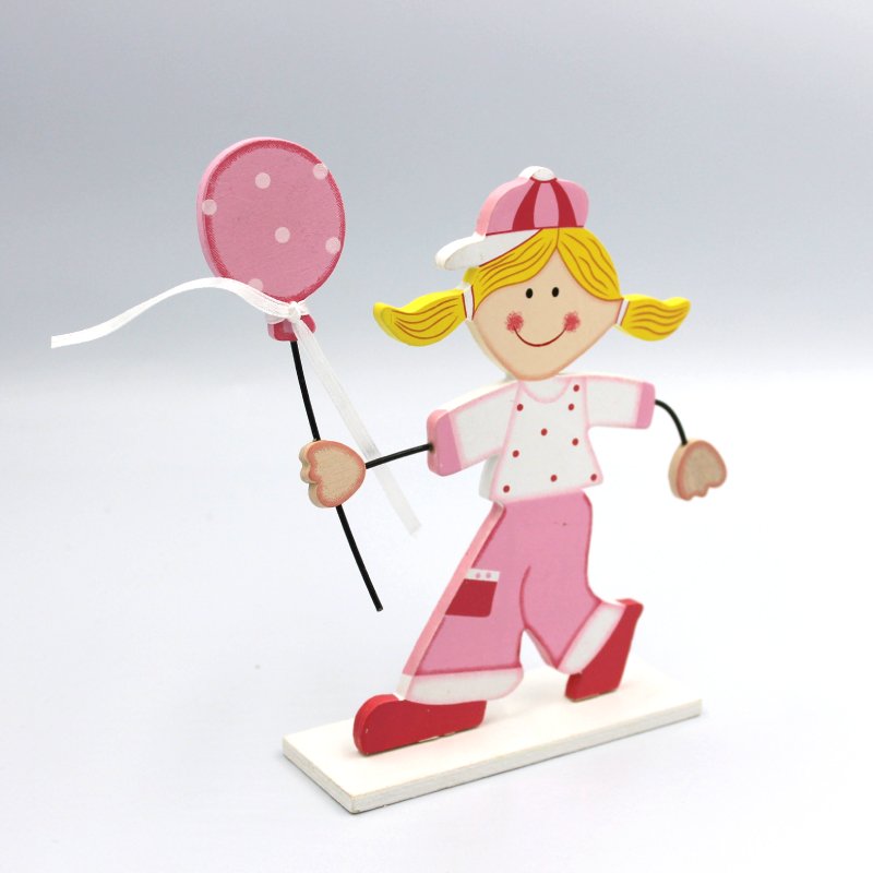 Διακοσμητική ξύλινη μπομπονιέρα κοριτσάκι με συρμάτινα άκρα πάνω σε ξύλινη βάση.