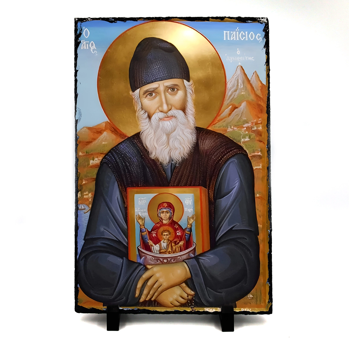 - Μοναδική Τέχνη: Κάθε εικόνα είναι χειροποίητη, με τον Άγιο Παΐσιο να απεικονίζεται με σεβασμό και λεπτομέρεια πάνω στην υφή της φυσικής πέτρας, προσδίδοντας ένα ξεχωριστό και αρχέγονο χαρακτήρα.