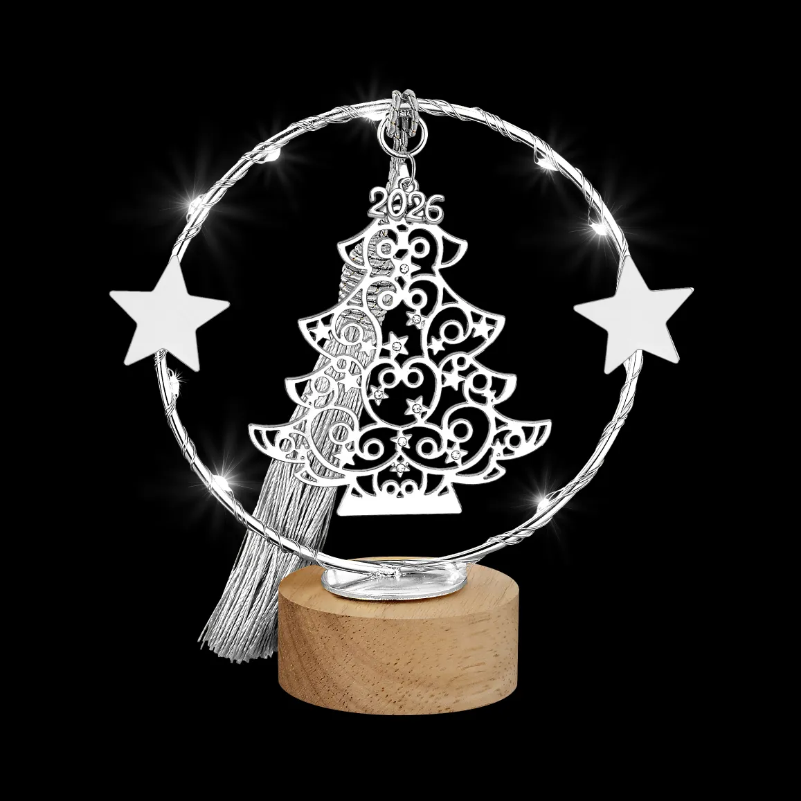 Το γούρι διαθέτει ένα περίτεχνο Ασημί Μεταλλικό Χριστουγεννιάτικο Δέντρο με το έτος 2026, που συμβολίζει την ευτυχία και τη γιορτινή διάθεση. Το σχέδιο περιβάλλεται από ένα μεταλλικό στεφάνι με ενσωματωμένα λαμπάκια LED που δημιουργούν μια ζεστή και παραμυθένια ατμόσφαιρα όταν φωτίζονται. Όλη η κατασκευή στηρίζεται σε μια κομψή, φυσική Ξύλινη Βάση, προσθέτοντας μια μοντέρνα πινελιά.