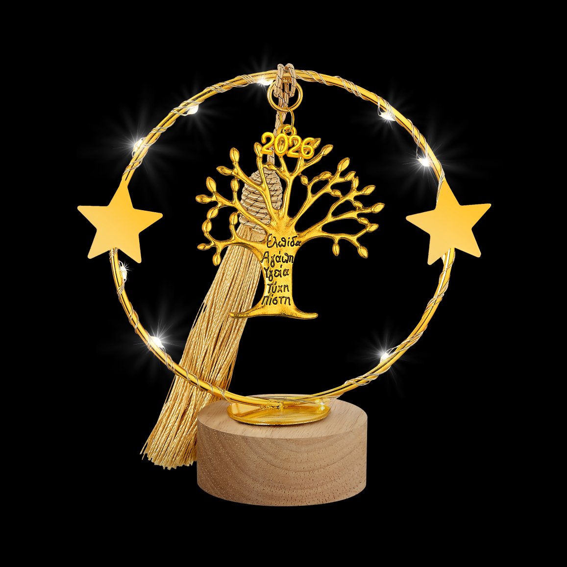Φωτιζόμενο Γούρι 2026 Χρυσό Δέντρο της Ζωής με ευχές σε Ξύλινη Βάση
