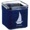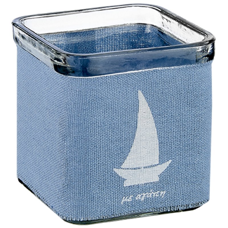 Γυάλινο Κηροπήγιο Κύβος Ντυμένο με Λινό Μπλε Ύφασμα με Σχέδιο Καράβι