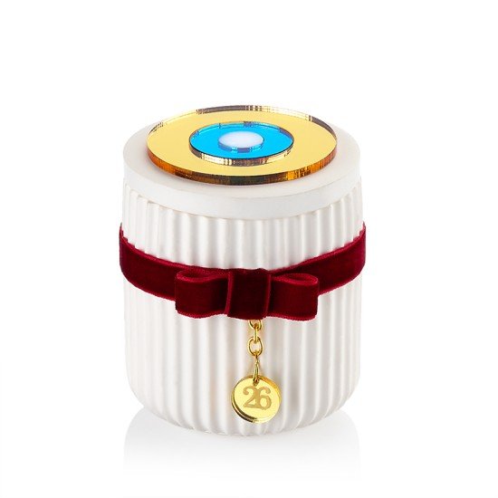 Το γύψινο βάζο είναι διακοσμημένο με μια πλούσια βελούδινη μπορντό κορδέλα και ένα χρυσό μεταλλικό γούρι με τον αριθμό “26”, καθιστώντας το ένα συλλεκτικό κομμάτι για το 2026. Το χρυσό-μπλε στοιχείο στο καπάκι προσδίδει μια μοντέρνα, glamorous πινελιά.