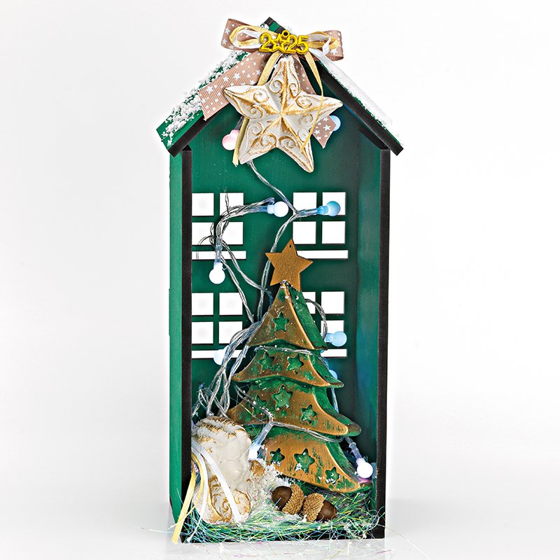 Γούρι 2025 Πράσινο Ξύλινο Σπιτάκι με Χριστουγεννιάτικο Δέντρο.