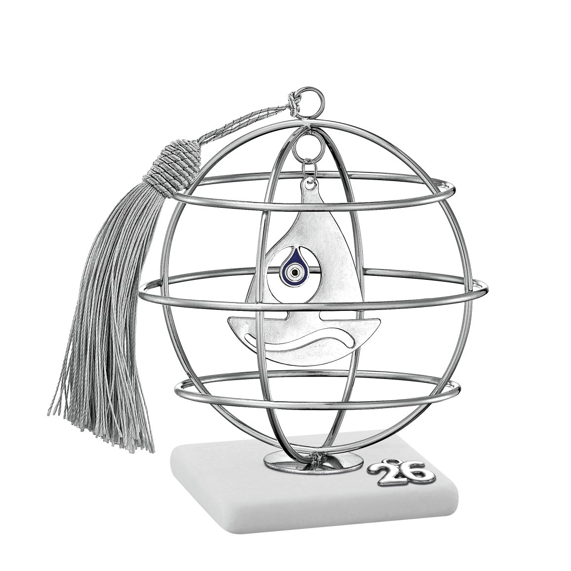 Το Γούρι 2026 Ασημί Μάτι μέσα σε Μεγάλη Μεταλλική Σφαίρα είναι ένα εντυπωσιακό διακοσμητικό που συνδυάζει μοντέρνα αισθητική και το πανάρχαιο σύμβολο της προστασίας. Το κρεμαστό μάτι, με διχρωμία λευκού–μπλε, αιωρείται στο κέντρο της χειροποίητης ασημί σφαίρας, δημιουργώντας ένα ιδιαίτερο και ξεχωριστό αποτέλεσμα.
