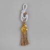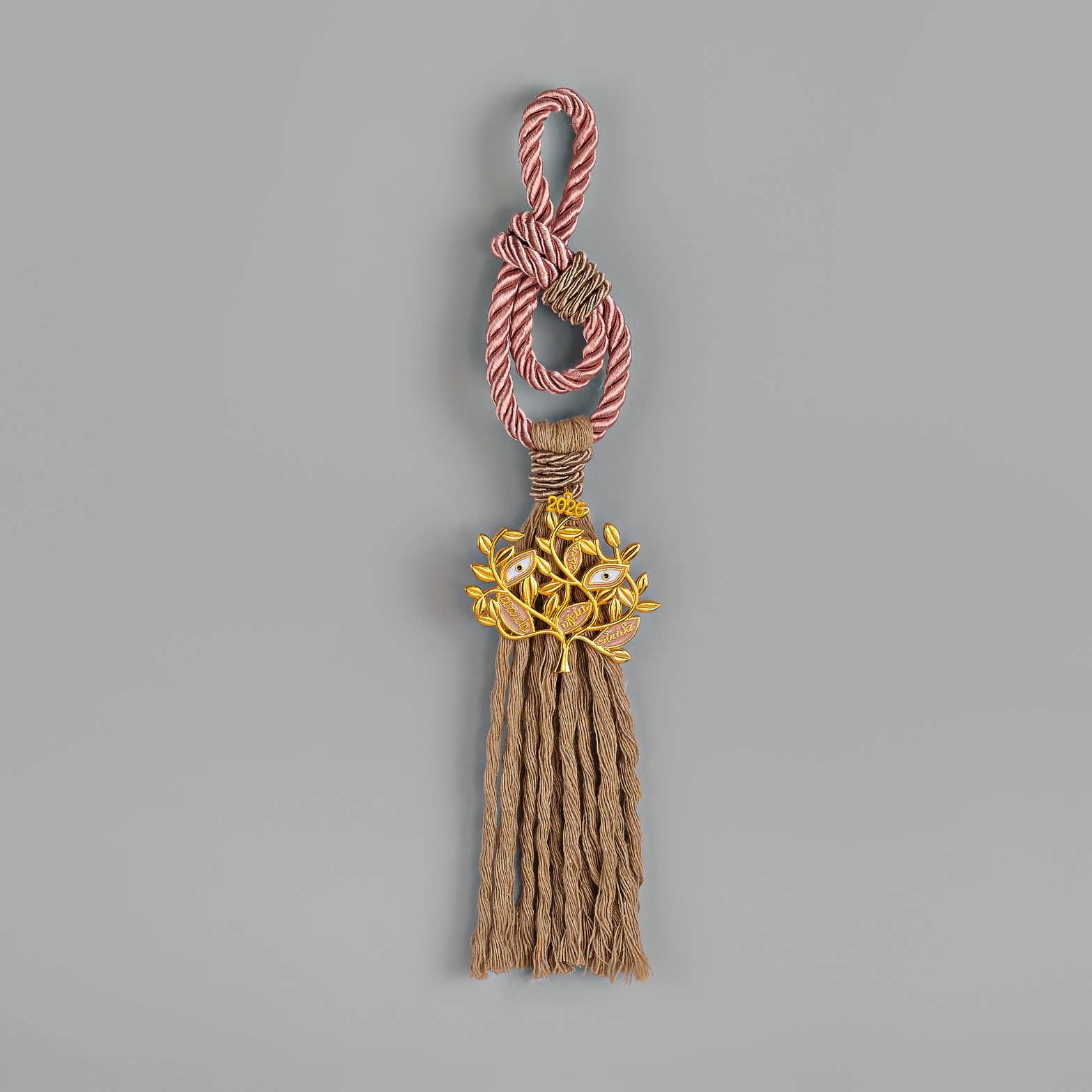 Το γούρι δένεται με εντυπωσιακό ροζ κορδόνι σε κόμπο-διακόσμηση και ολοκληρώνεται με πλούσια μπεζ φούντα, δημιουργώντας έναν συνδυασμό ζεστού και φινετσάτου design που ταιριάζει σε κάθε χώρο.