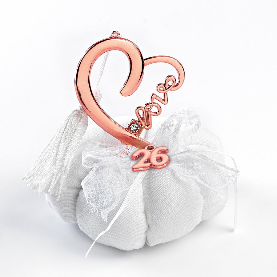Το γούρι αποτελείται από μια υφασμάτινη, λευκή κολοκύθα (ή κολοκύθι). Στο πάνω μέρος, δεσπόζει ένα εντυπωσιακό μεταλλικό σχέδιο Καρδιάς, με το Love γραμμένο καλλιγραφικά και ένα λαμπερό στρασάκι. Το μέταλλο έχει το μοντέρνο χρώμα Rose Gold (Ροζ Χρυσό). Η σύνθεση περιλαμβάνει μια λευκή δαντελένια κορδέλα, το έτος 26 σε Rose Gold, και μια λευκή φούντα.