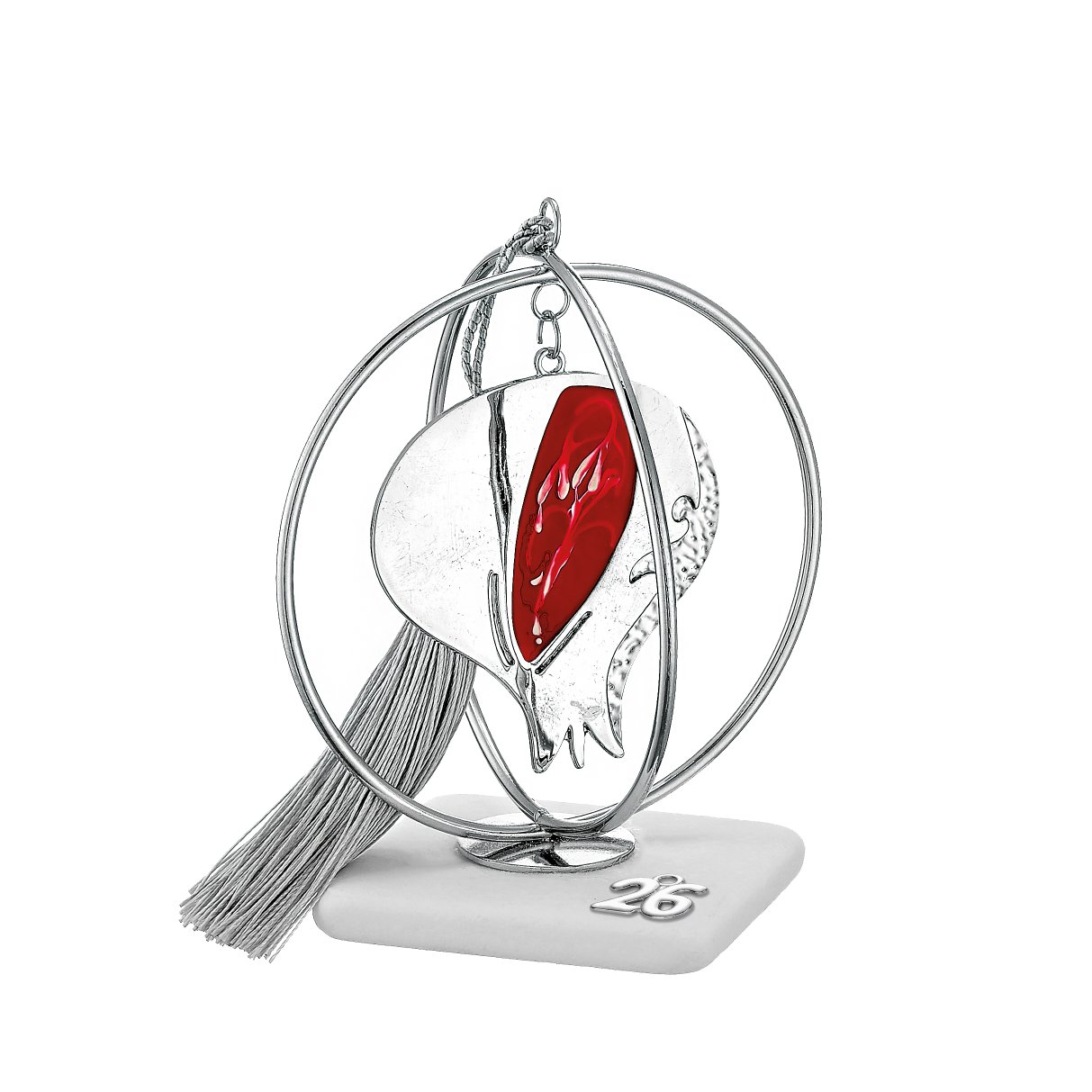 Το ρόδι, διαχρονικό σύμβολο καλής τύχης, είναι σχεδιασμένο σε κομψή ασημένια μεταλλική φόρμα με έντονη κόκκινη διακόσμηση στο κέντρο, που προσθέτει ζωντάνια και δυναμισμό.Η κομψή ασημί φούντα και ο αριθμός 26 στη βάση ολοκληρώνουν μια μοντέρνα αλλά και παραδοσιακή πρόταση δώρου για το νέο έτος.