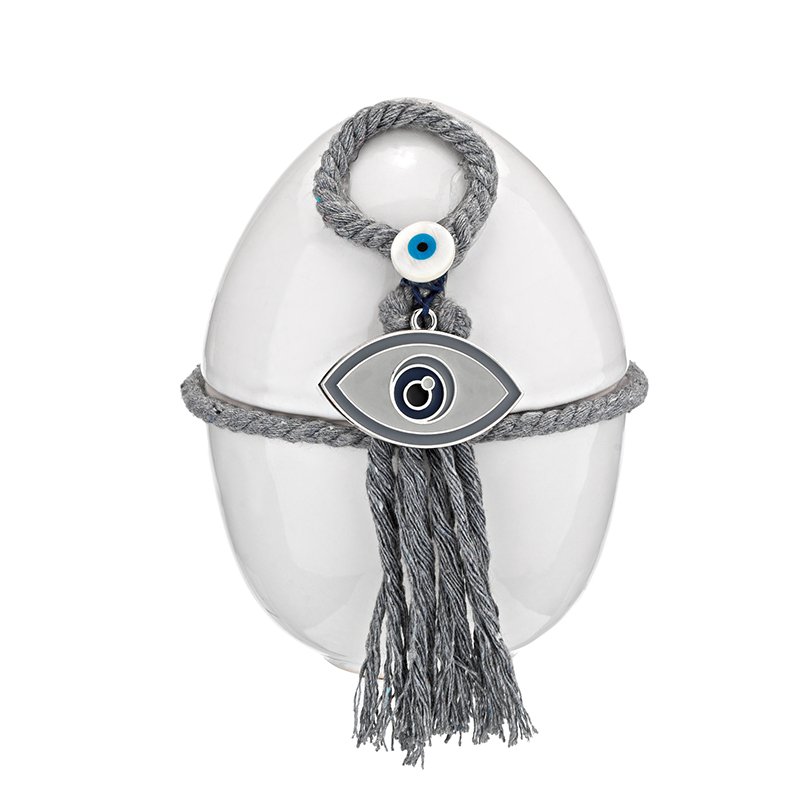 Κεραμική φοντανιέρα σε σχήμα αυγού κατασκευασμένη από εξαιρετικής ποιότητας υλικά. Η φοντανιέρα είναι γυαλισμένη και πάνω της βρίσκονται γκρι κορδόνια και ματάκια. Ιδανική επιλογή για να διακοσμήσετε το χώρο σας για το Πάσχα, αλλά και κατάλληλο δώρο για τα αγαπημένα σας πρόσωπα.