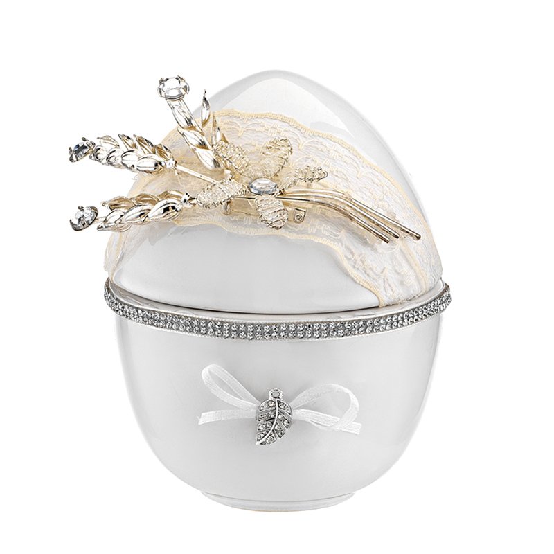 Κεραμική φοντανιέρα σε σχήμα αυγού κατασκευασμένη από εξαιρετικής ποιότητας υλικά. Η φοντανιέρα είναι γυαλισμένη και πάνω της βρίσκονται εντυπωσιακά ασημί στοιχεία και εκρού κορδέλα. Ιδανική επιλογή για να διακοσμήσετε το χώρο σας για το Πάσχα, αλλά και κατάλληλο δώρο για τα αγαπημένα σας πρόσωπα.