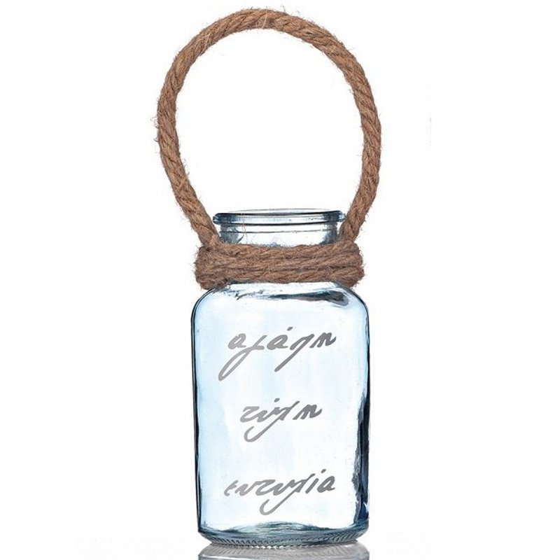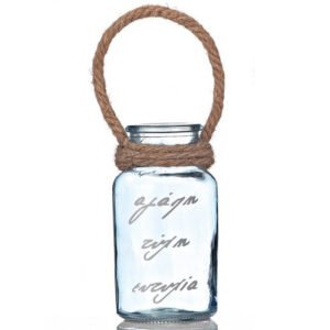 Κρεμαστό Γυάλινο Μπλε Κηροπήγιο με Ευχές και Κορδόνι Λινάτσα