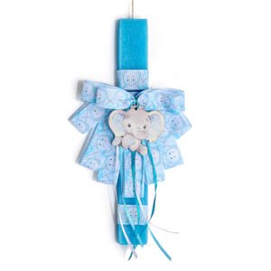 Αυτή η λαμπάδα είναι δημιουργημένη πάνω σε αρωματικό κερί υψηλής ποιότητας σε σιέλ χρώμα με rustic υφή. Το κεντρικό διακοσμητικό είναι ένα υπέροχο ξύλινο ελεφαντάκι σε γαλάζιους και γκρι τόνους, το οποίο είναι τοποθετημένο πάνω σε έναν πλούσιο, πολυεπίπεδο φιόγκο από κορδέλες με αντίστοιχα παιδικά μοτίβα.