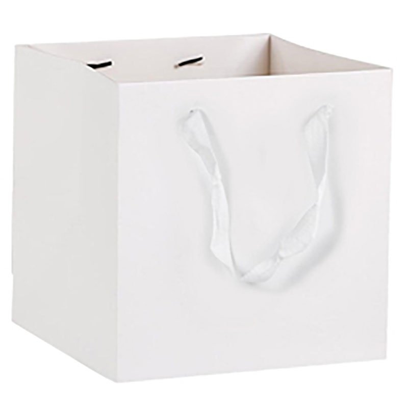 Τσάντα κύβος σε λευκό χρώμα κατασκευασμένη από εξαιρετικής ποιότητας χαρτί, με πρακτικό ιμάντα για εύκολη μεταφορά.