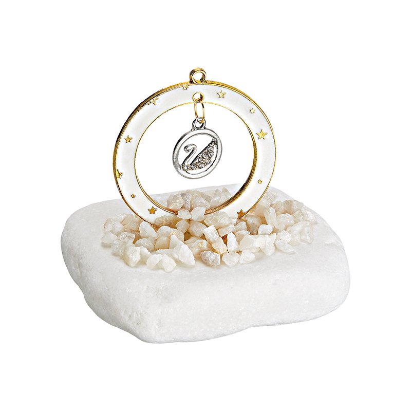 Βότσαλο σε ακανόνιστο σχήμα σε λευκό χρώμα με λευκό μεταλλικό κύκλο και κύκνο με στρας από εξαιρετικής ποιότητας υλικά.