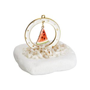 Το Λευκό Ακανόνιστο Βότσαλο με Λευκό Μεταλλικό Κύκλο και Κομμάτι Καρπουζιού είναι ένα χαρούμενο, καλοκαιρινό διακοσμητικό που συνδυάζει φρεσκάδα και χιούμορ με κομψότητα. Το καρπούζι, σύμβολο καλοκαιριού, δροσιάς και ανεμελιάς, αποδίδεται με μοντέρνο ύφος μέσα σε έναν λευκό μεταλλικό κύκλο, πάνω σε φυσικό λευκό βότσαλο με ακανόνιστο σχήμα.