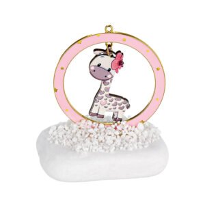 Το Λευκό Ακανόνιστο Βότσαλο με ρόζ Μεταλλικό Κύκλο και Ξύλινη Καμηλοπάρδαλη είναι ένα χαριτωμένο και πρωτότυπο διακοσμητικό που συνδυάζει το φυσικό στοιχείο της πέτρας με παιχνιδιάρικα και οικολογικά υλικά όπως το ξύλο. Η ξύλινη καμηλοπάρδαλη, τοποθετημένη μέσα στον ρόζ μεταλλικό κύκλο, δημιουργεί ένα κομψό και ιδιαίτερο αποτέλεσμα – ιδανικό για παιδικά και θεματικά concepts.