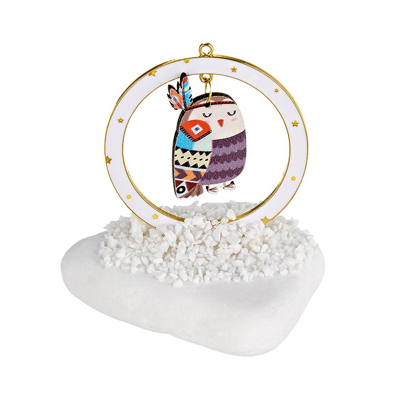 Λευκό Ακανόνιστο Βότσαλο με Λευκό Μεταλλικό Κύκλο και Ξύλινη Κουκουβάγια