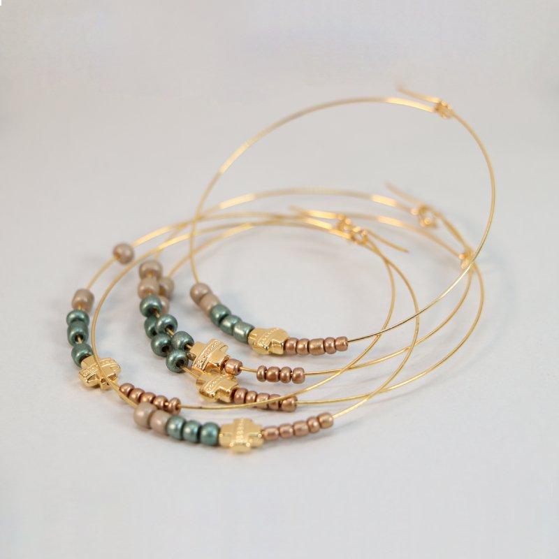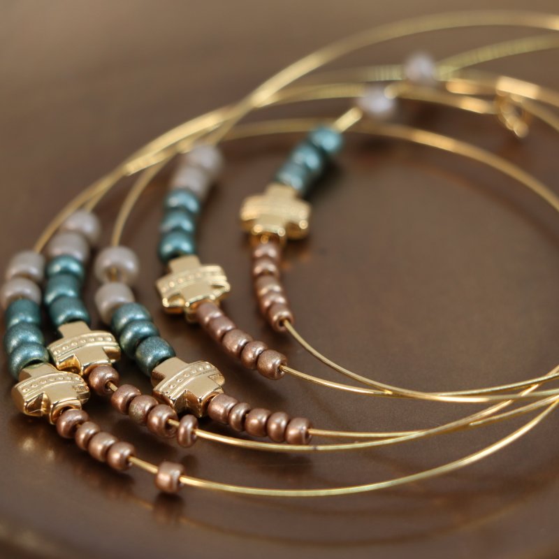 Μεταλλικό βραχιόλι διακοσμημένο με χαντρούλες και μεταλλικό σταυρουδάκι.