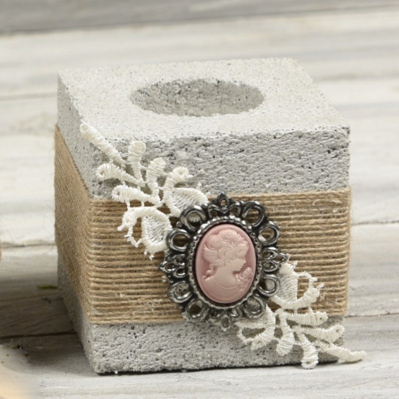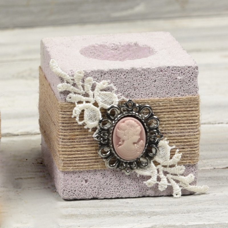 Πέτρινη μπομπονιέρα ρεσό σε απαλή απόχρωση σάπιου μήλου και διακόσμηση με σύνθεση από δαντέλα και αγκράφα με καμέο