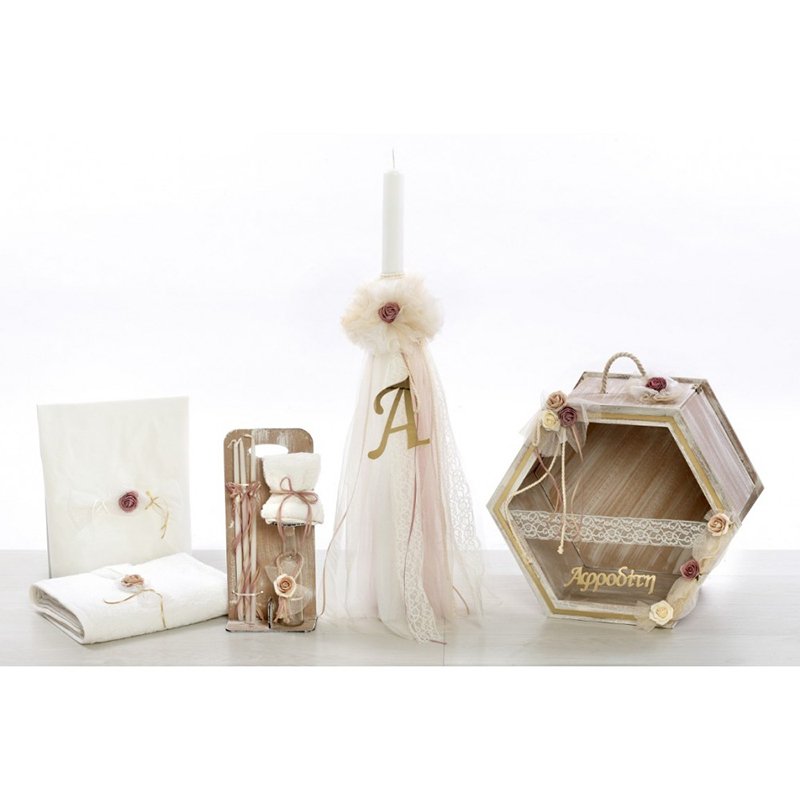 Στο ολοκληρωμένο βαπτιστικό σετ περιλαμβάνεται: 1) η κούτα, 2) η λαμπάδα, 3) το σταν λαδιού και 4) το λαδόπανο.