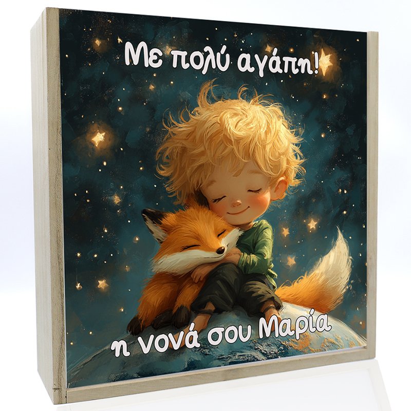 Προσωποποιημένο τετράγωνο κουτί ξύλινο σε φυσικό χρώμα με pvc διαφάνεια και εκτυπωμένο θέμα μικρός πρίγκιπας κατασκευασμένο από εξαιρετικής ποιότητας υλικά.
