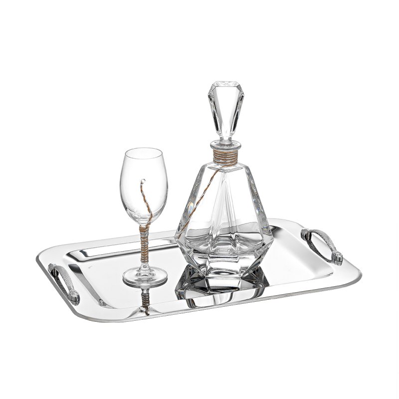Γαμήλιο σετ με μία καράφα, ένα δίσκο, δύο ποτήρια σαμπάνιας και ένα ποτήρι κρασιού κατασκευασμένα από εξαιρετικής ποιότητας υλικά. Εξαιρετική επιλογή για ένα γάμο που θα εντυπωσιάσει και θα μείνει στο βάθος του χρόνου.
