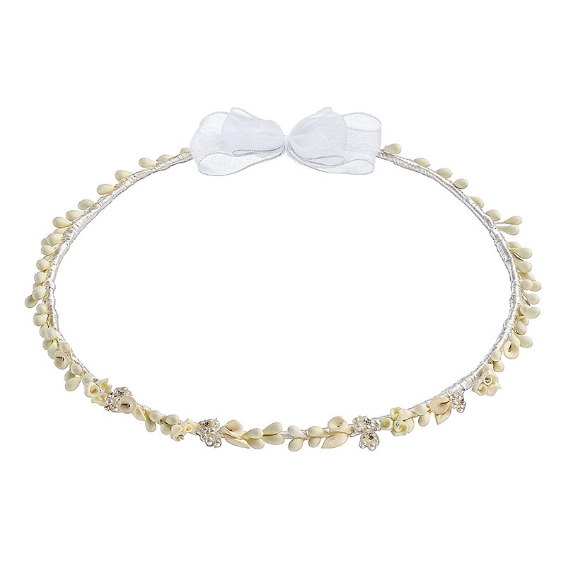 Χειροποίητα στέφανα γάμου με λευκό φιόγκο στολισμένα εντυπωσιακά με ιβουάρ στοιχεία και λουλούδια.