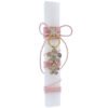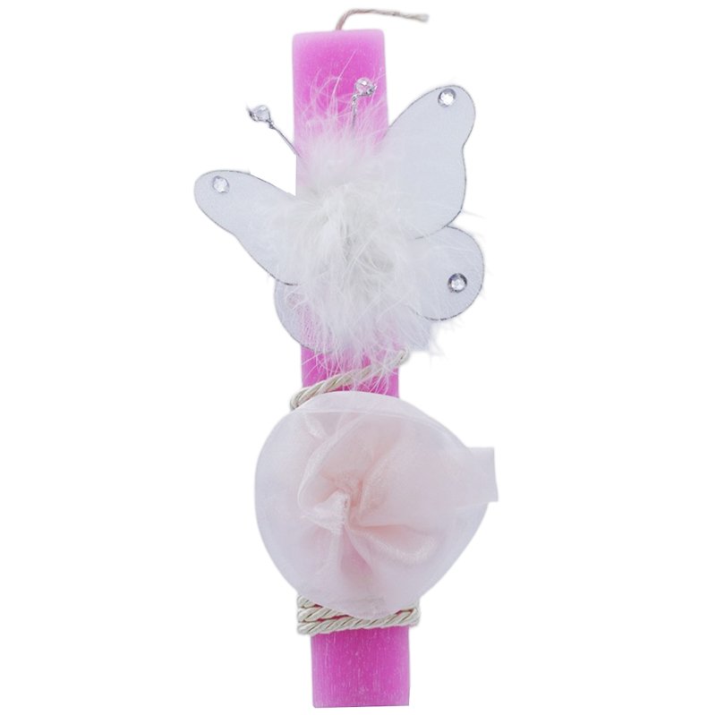 Αυτή η πασχαλινή λαμπάδα είναι χειροποίητη και κατασκευασμένη για να εντυπωσιάσει με την εξαιρετική ποιότητα της και τα χρώματα της. Είναι στολισμένη με εκρού κορδόνι. Πάνω της βρίσκεται λευκή υφασμάτινη πεταλούδα με πούπουλα και στρας, αλλά και ένα ροζ υφασμάτινο λουλούδι. Κάντε δώρο στα αγαπημένα σας πρόσωπα μία πασχαλινή λαμπάδα η οποία ξεχωρίζει και θα μείνει στο βάθος του χρόνου.