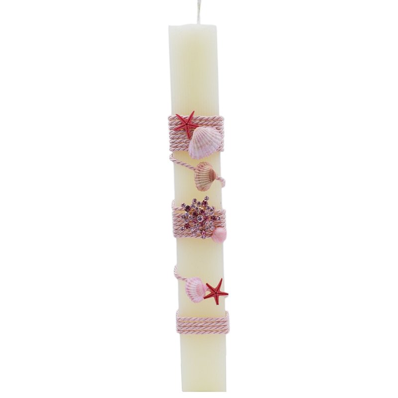 Η λαμπάδα είναι διακοσμημένη με απαλό ροζ κορδόνι και επιλεγμένα κοχύλια σε ροζ αποχρώσεις που προσδίδουν έναν φυσικό αλλά ταυτόχρονα καλλιτεχνικό χαρακτήρα. Το στοιχείο που απογειώνει την αισθητική της είναι η καρφίτσα πολυτελείας με αστραφτερά στρας σε ροζ και φούξια χρώμα η οποία προσφέρει μια ασύγκριτη λάμψη κάτω από το φως της πασχαλινής νύχτας.